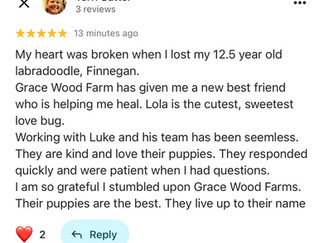 āOur puppy, Luna, has been such a blessing. She picked up house training within the first two weeks and loves to cuddle after playtime. We credit her easygoing nature to the loving environment she came from. Grace Wood Farm gave us the perfect companion.ā